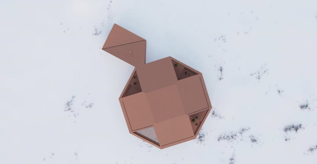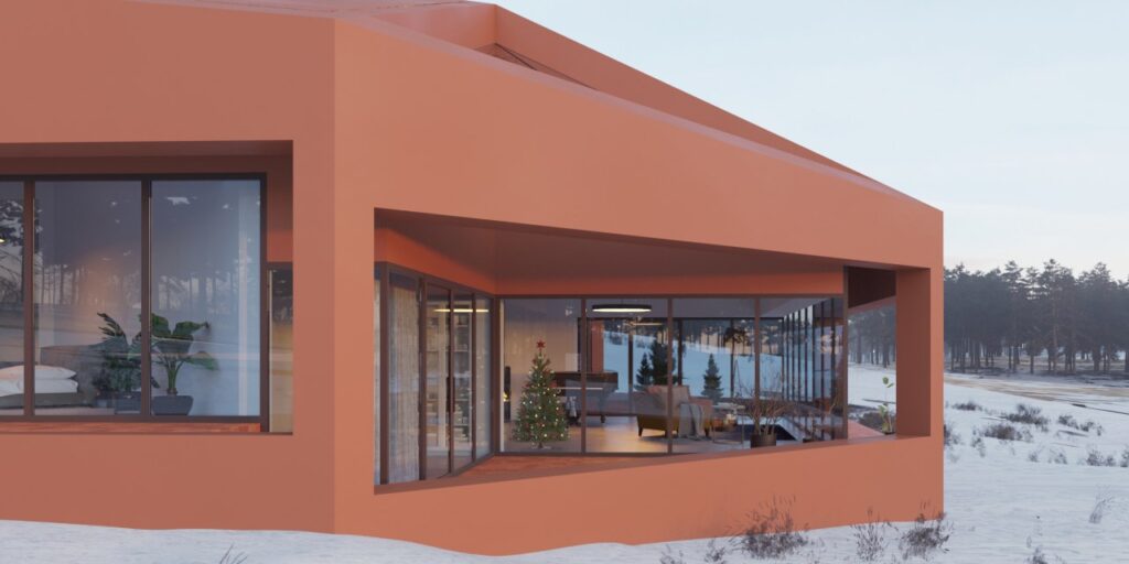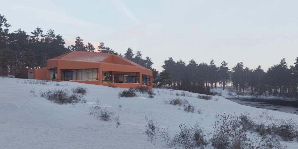 at the same time, shielding the inhabitants from the outside world. As if knocked slightly off balance, it “slides’ down the hill toward the lake, creating a very subtle illusion of movement. The red terracotta colour emphasizes its shape and details in contrast with both lush summer greenery and austere winter landscapes.