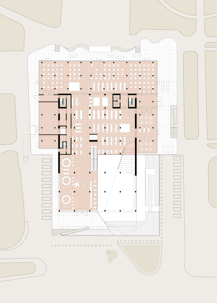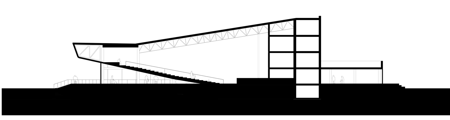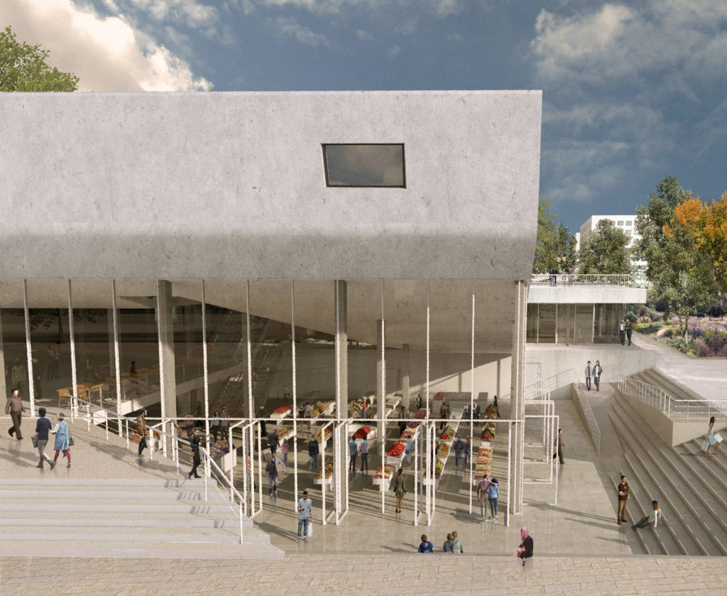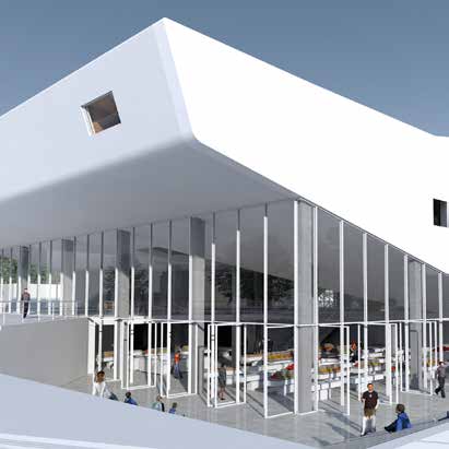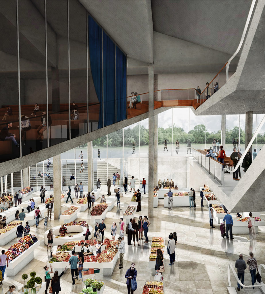 also preserves the original function of the building, but makes the new cinema hall smaller: it is suspended over the market space and also works as a connecting ramp.